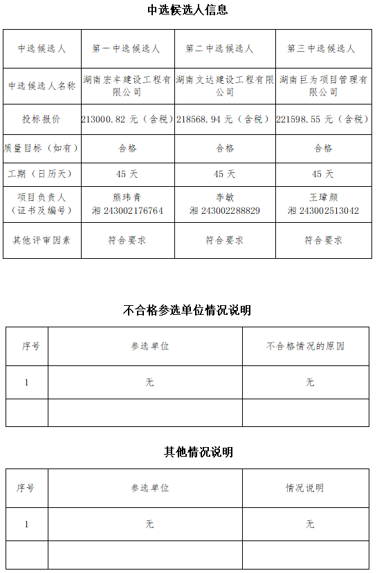 永州分公司涉水檢驗設施建設工程 于2025年9月25日在永州市冷水灘區長豐集團辦公樓二樓評標室進行了比選開標、評標活動,評標委員會按照比選文件及相關法律法規規定進行評審,推薦以下三名中選候選人(排序),現將相關信息予以公示。