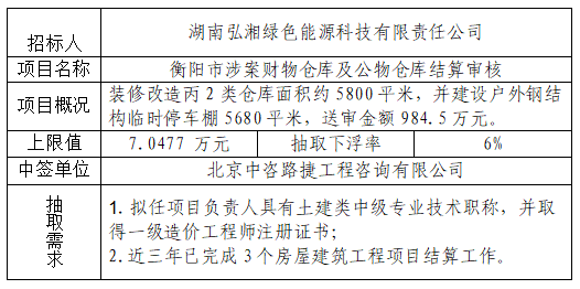 衡陽市涉案財物倉庫及公物倉庫項目結算審核項目于2025年10月30日在衡陽國投4棟3樓評標室進行了隨機抽取,現將相關信息予以公示。