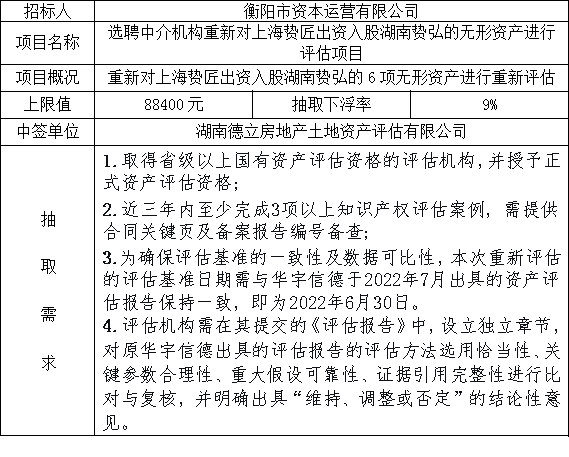 選聘中介機構重新對上海贄匠出資入股湖南贄弘的無形資產進行評估項目于2025年11月14日在衡陽國投4棟3樓評標室進行了隨機抽取,現將相關信息予以公示。